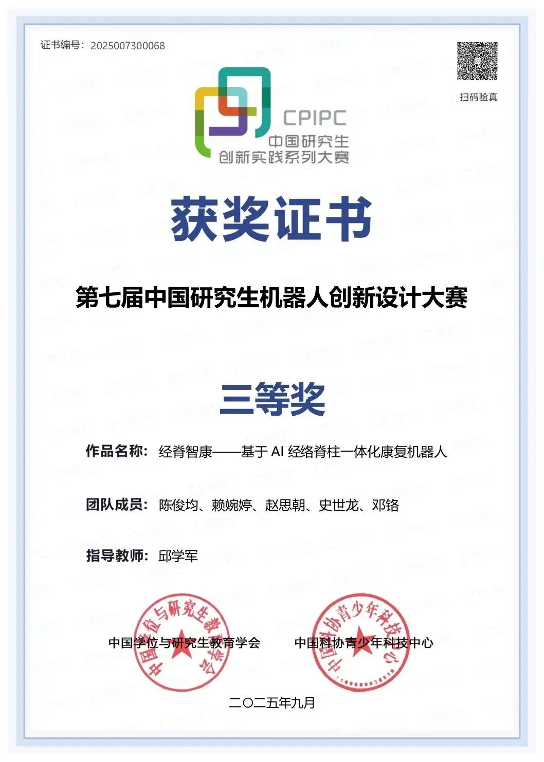 9月26日至28日,由教育部学位管理与研究生教育司指导,中国学位与研究生教育学会、中国科协青少年科技中心共同主办,济南市委人才工作领导小组办公室、山东建筑大学承办的第七届中国研究生机器人创新设计大赛全国总决赛在济南落下帷幕。由我校中医学院(智能康复产业学院)邱学军老师指导、电子信息(人工智能)专业研究生陈俊均领衔的 “广药智能康复团队”首次挺进这项国家级 A 类赛事总决赛,并成功斩获三等奖,为学校医工融合育人实践交出亮眼答卷。
