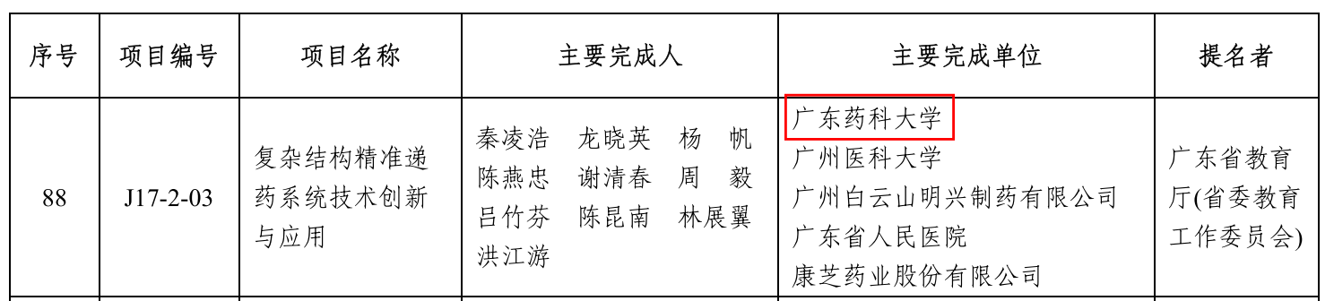 其中,以我校为第一完成单位,秦凌浩研究团队主持的“复杂结构精准递药系统技术创新与应用”项目聚焦复杂结构药物递送关键领域,通过不懈努力钻研,成功突破了传统制剂精准给药技术瓶颈。秦凌浩研究团队依托广东省药物制剂研究与评价重点实验室,针对药物吸收问题开展了基础理论、关键技术、创新产品的系统性研究,并基于药物理化特性和临床治疗需求,设计构建了功能化、调释化、智能化的复杂结构递药系统,旨在实现不同应用环境下,选择性调节药物吸收的目标,切实提升用药安全性和临床疗效。该成果获新药证书3个,境外(香港)药品注册证书3个,临床应用3D打印分剂量片超12万人次,授权发明专利25项,代表论文单篇引用超250次,推广应用累计销售22亿元,有效推动了复杂结构递药体系的基础与应用研究,对加速我省以及带动粤港澳大湾区高端制剂的开发推广具有示范促进作用。
