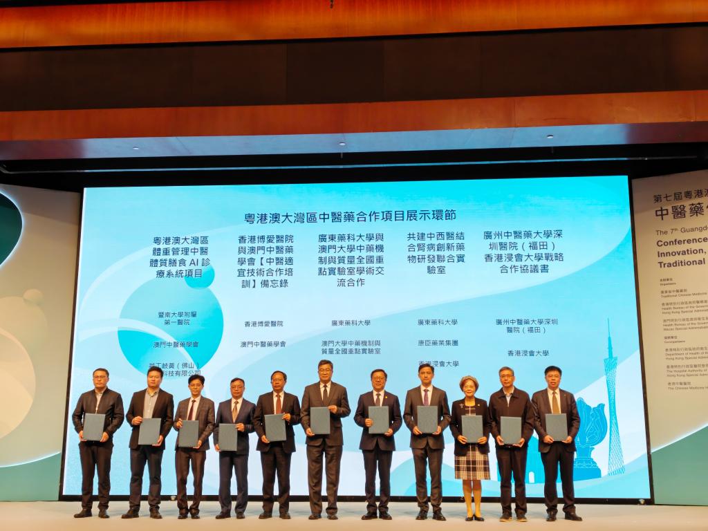 会议期间签署了30项粤港澳大湾区中医药合作项目。学校积极服务粤港澳大湾区中医药高等教育与科研创新合作,与澳门大学签署中药机制与质量全国重点实验室学术交流合作协议,将重点开展中药领域师资交流、学术研究、人才培养等合作;与香港中文大学中医学院签署学术交流协议,将开展中医领域师生互访、科研合作等项目;与香港浸会大学、康臣药业集团签署共建“中西医结合肾病创新药物研发联合实验室”协议,拟共建“肾病药物研究中心”,开展整合生命组学和人工智能大数据对中药复方防治慢性肾病的药理机制研究与药物研发等。