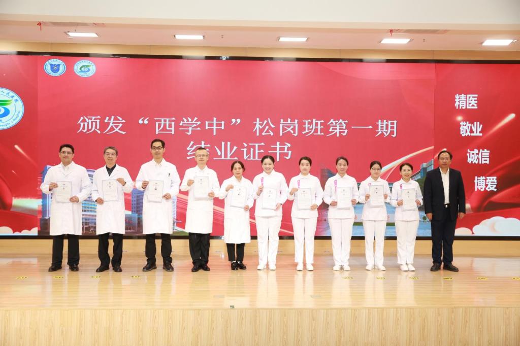 翟理祥为“西学中”松岗班(第一期)学员代表颁发结业证书,并为“西学中”松岗班(第二期)及后备人才管理培训班授班旗。他在开班致辞中表示,本次“西学中”培训与管理培训同步推进,是基于对新时代医院高质量发展需求的深刻洞察进行的战略性布局。两者相辅相成,共同服务于医院“内涵提升”与“外延拓展”目标,旨在推动医院构建“精湛医术”与“卓越管理”双轮驱动的发展新格局。他勉励学员在“西学中”学习中拓宽视野、融会贯通,在管理研修中锤炼本领、提升格局,努力成长为推动医院变革与发展的中坚力量。