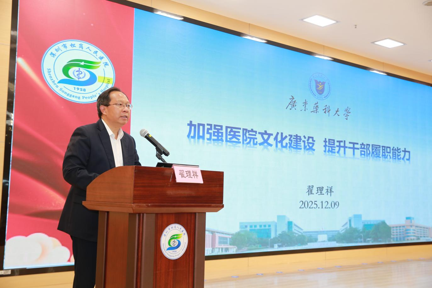 12月9日,广东药科大学-深圳市宝安区松岗人民医院“西学中”培训班暨后备人才管理培训班联合典礼在松岗人民医院举行。学校党委副书记、校长翟理祥,深圳市宝安区卫生健康局副局长韩静,深圳市宝安区松岗人民医院领导班子,学校继续教育学院负责人和来自宝安区各医疗机构的参训学员参加典礼。