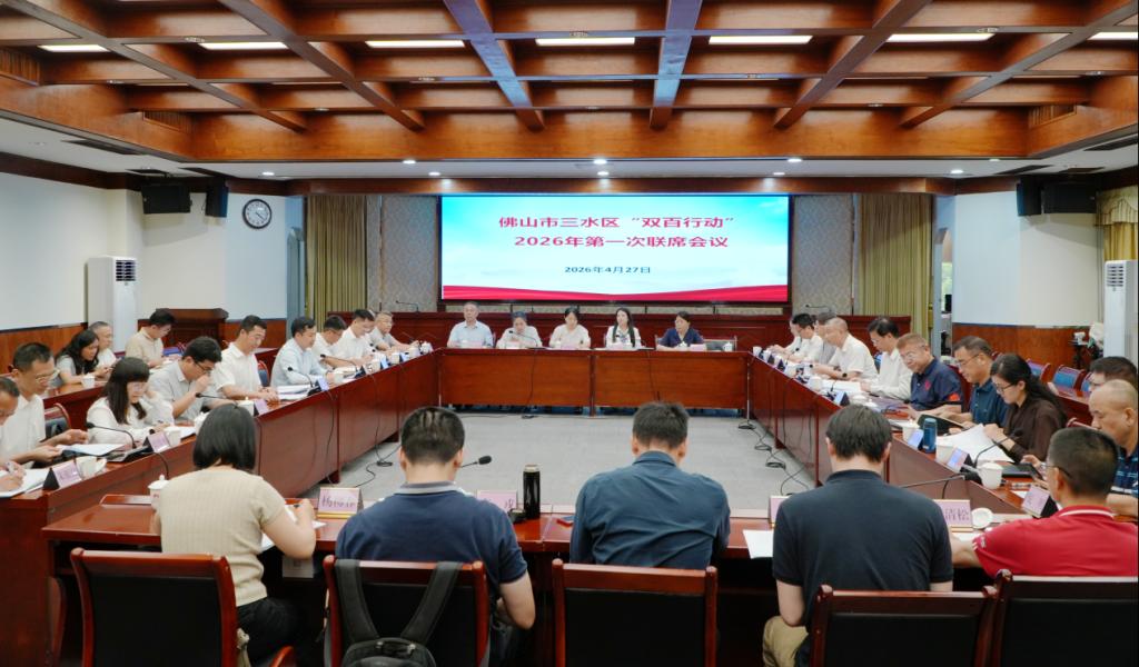 4月27日,佛山市三水区人民政府、广东药科大学、佛山职业技术学院在三水区人民政府会议室举行“双百行动”2026年第一次联席会议,围绕“树立和践行正确政绩观,推动‘双百行动’重点项目提质增效”主题,全面盘点阶段性工作成效,系统部署下一步工作任务。三水区委书记吴磊、广东药科大学党委书记刘晟、佛山职业技术学院副校长赵银生出席会议并讲话。三水区相关部门及街道负责人、两校相关部门负责人等共30余人参加会议。