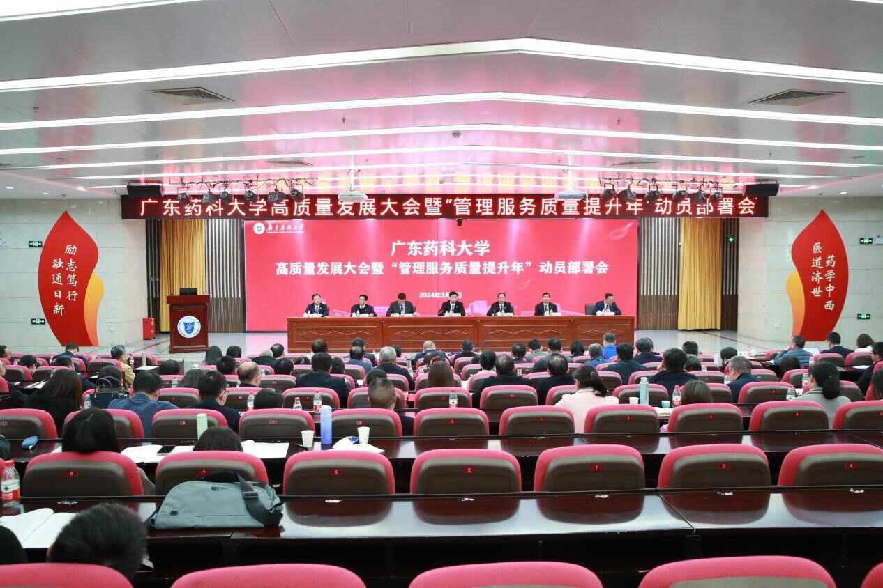 3月4日,广东药科大学召开学校高质量发展大会暨“管理服务质量提升年”动员部署会,动员全校力量,贯彻落实全省高质量发展大会和全省教育工作会议精神,以“管理服务质量提升年”为重点,围绕推动“党建领航、育人精品、学科培优、人才赋能、创新提质、保障增效”学校高质量发展“六大工程”,明确方向,坚定信心,鼓舞干劲,以奋发有为的精神扎实奋力推动高水平药科大学建设再上新台阶,更好地服务全省高质量发展。