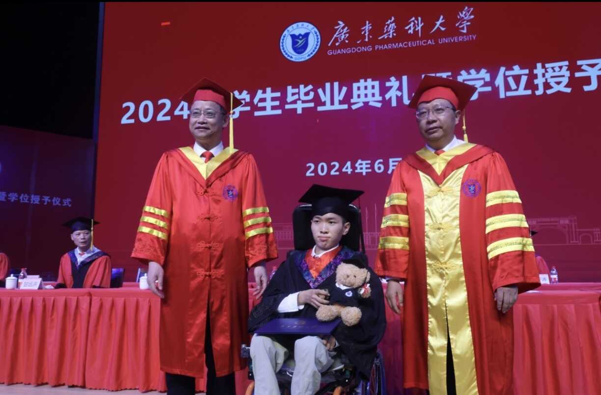 “他用自己的实际行动诠释了自强不息、追求卓越的广药大人精神,书写了无愧于自己的青春华章。”广东药科大学党委书记刘晟高度评价蔡泽勋同学是“勇敢的自强之星”“轮椅上的追梦人”,号召同学们以他为学习榜样,并亲自为他颁发学位证书,翟理祥也为蔡泽勋拨穗正冠,现场掌声雷动。