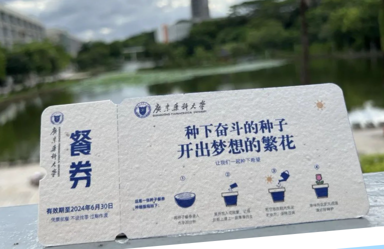 在毕业前夕,广东药科大学的毕业生还领到一份寓意满满的“种子”餐券。这张餐券是一份美食的凭证,毕业生凭毕业餐券副券可以在学校广州校区、中山校区、云浮校区任一食堂享用一顿美味的毕业餐,再尝尝母校的味道。这张餐券还是一张种子餐券,主券内藏着一颗颗经过精心挑选、易于种植的鲜花种子,当学子们将种子播入土壤,浇灌它成长,就会开出绚烂的“繁花”,承载了学校对毕业生们的深情厚意和美好期望。