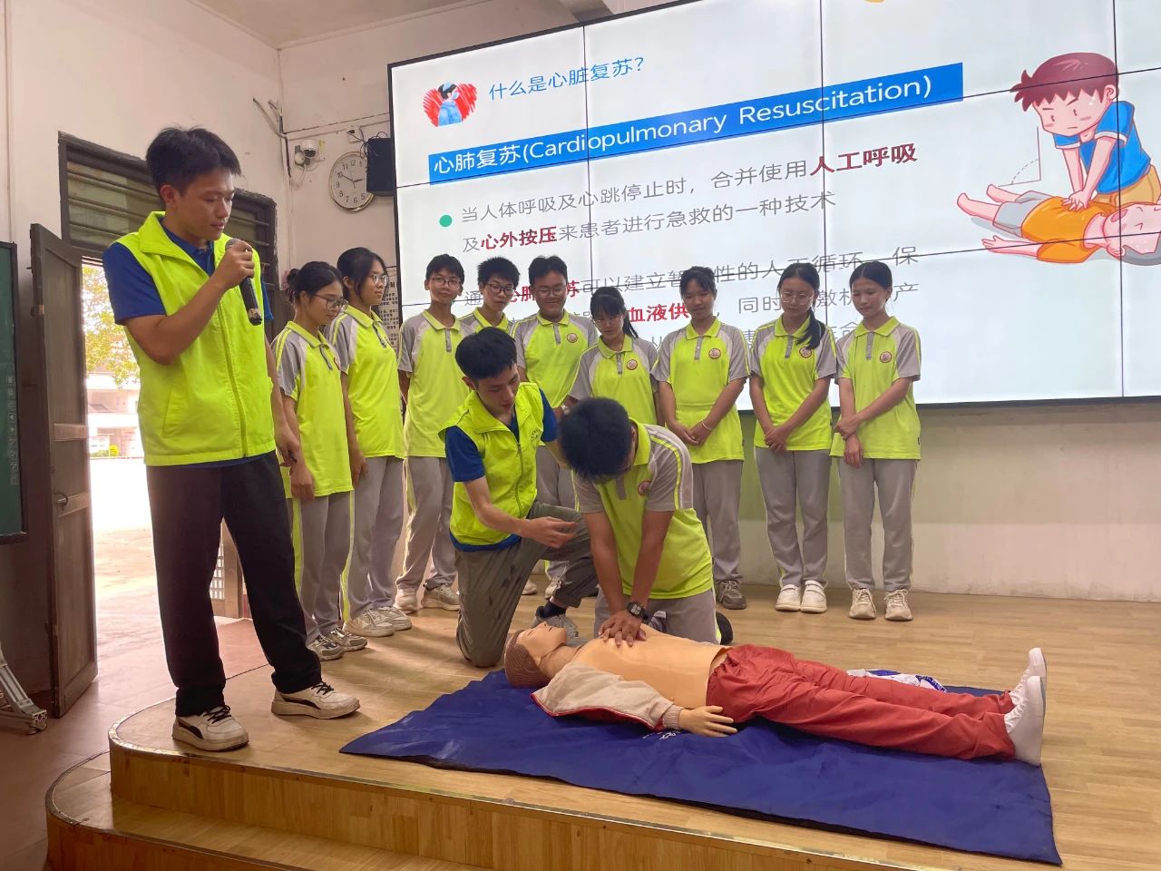 为让医学资源真正下沉基层,两校将应急救护帮扶纳入“书记工程”,依托“双百行动”组建35支专家服务队,带着急救理论教材、实操演示教具深入怀集各中小学校园开展“送教上门”。从心肺复苏按压深度、AED电极片粘贴位置等细节精讲,到模拟突发场景应急处置演练,专家们把前沿医学知识转化为接地气的教学内容,为当地师资培训注入“源头活水”。