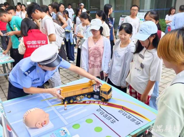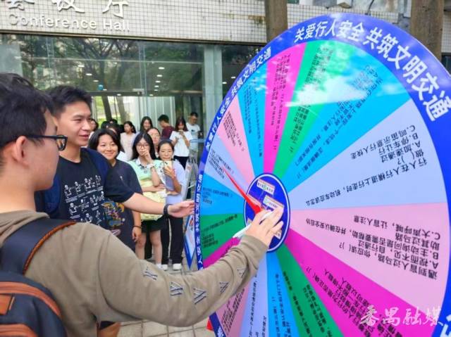 现场设置的互动体验区域同样亮点十足:交通安全知识展板前,参与者驻足了解车辆盲区、分心驾驶、酒后驾驶、佩戴安全头盔等知识;“交通安全知识问答大转盘”围绕行人安全出题,参与者转动转盘答题即可赢取礼品,在趣味互动中巩固所学知识;大车转弯演示区里,民警通过模拟大车右转弯时前后轮的行进轨迹,向参与者讲解内轮差的形成原理与潜在危险;泥头车盲区体验环节中,参与者通过亲身体验“司机视角”与“行人视角”的差异,在真实场景中感知风险,进而理解远离大车盲区的重要性。同时,民警还向参与者派发印有交通安全知识要点的宣传单张与反光贴,进一步织密道路安全防护网。