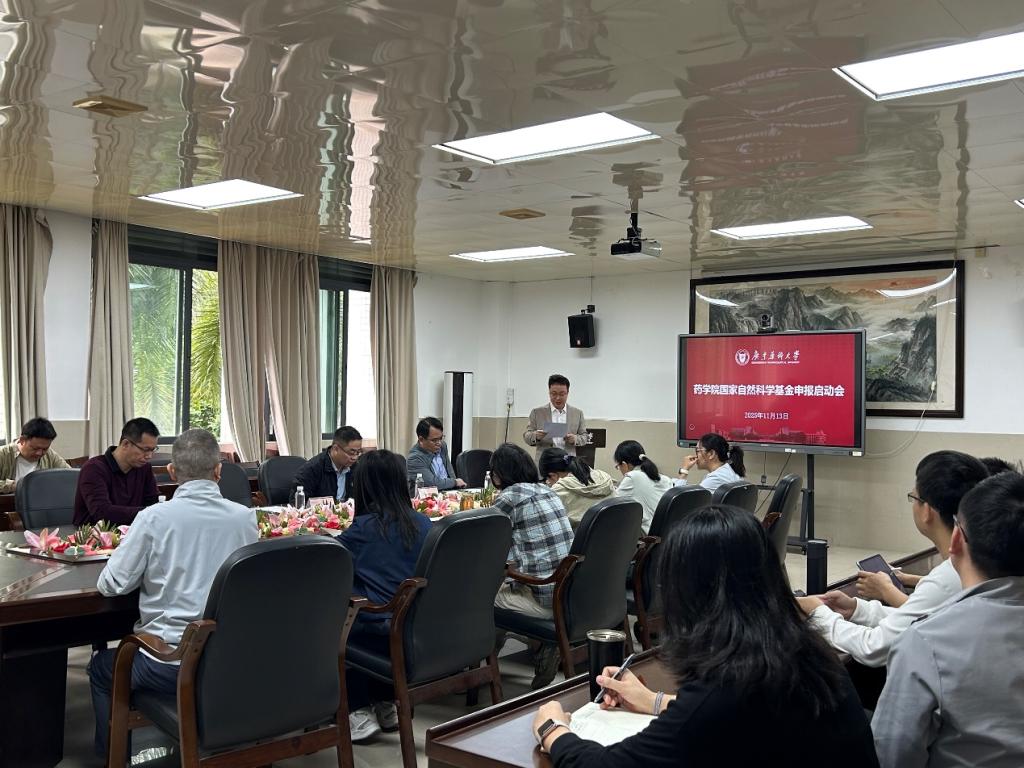 11月13日,药学院、临床药学院在大学城校园召开2026年度国家自然科学基金申报启动会。会议邀请了南方医科大学药学院蔡铮教授、中山大学中山医学院梁思佳教授、我校科学技术部部长杨彦教授进行国家自然科学基金申报讲解和辅导。学院党委书记陈韶峰、领导班子成员以及学院2026年度国家自然科学基金申请人共同参加了本次会议。