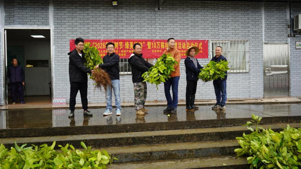 3月10日,由广东药科大学肉桂(罗定)产业研究院与中共连州镇委、连州镇人民政府主办的“连州镇2026年植树节·绿美行动暨肉桂苗捐赠活动启动仪式”在连州镇举行。参加活动的有连州镇党委书记,罗定市中医药局、中医药发展促进中心负责人,连州镇云致、云良、蒲垌、高垌、白马、平北村干部和肉桂种植户代表,肉桂(罗定)产业研究院负责人及中药学院教师代表。